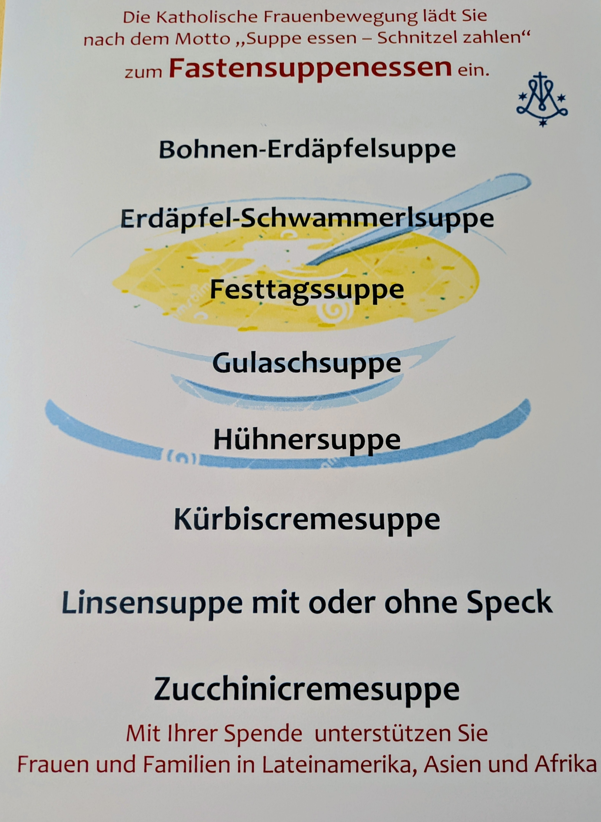 Nach dem Motto "Suppe essen - Schnitzel zahlen" werden mit den eingenommenen Spenden Frauen und Familien in Lateinamerika, Asien und Afrika unterstützt.